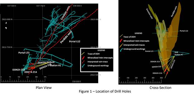 Drillhole DDH24-213 targeted a previously untested zone, approximately 20m below the active mine workings of Level 23, and intersected a new high-grade brecciated zone within the El Creston vein system that returned 7.9m of 2.59 g/t Au, 68.41 g/t Ag, 0.68% Cu, 2.32% Pb, and 2.73% Zn within a larger 22.3m zone of 1.47 g/t Au, 41.88 g/t Ag, 0.44% Cu, 1.46% Pb, and 2.34% Zn from 201.2m. Figure 1 presents the location of the drillholes and Tables 1 and 2 provide drill collar details.