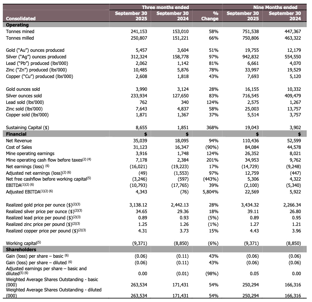 The Company initially anticipated generating between $30 million and $40 million(1) in Net Free Cash Flow before working capital adjustments for the year. However, following additional capital investments to accelerate mine development and infrastructure upgrades, together with lower-than-expected gold and zinc output during the second and third quarters of 2025 as mining progressed through lower-grade areas, full-year Net Free Cash Flow is now expected to be between $5 million and $10 million.