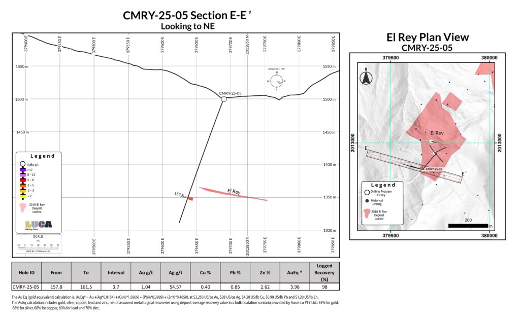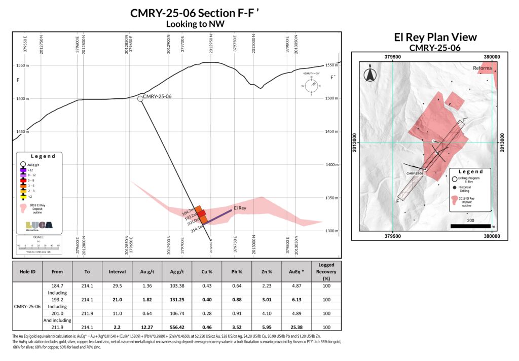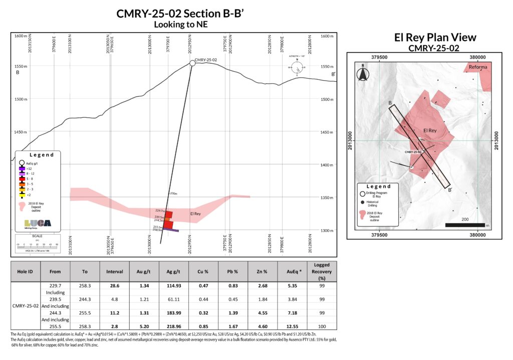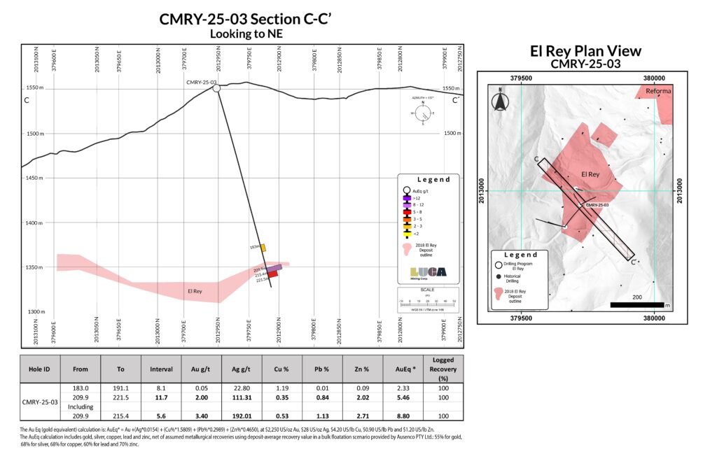 “The first drilling at El Rey in over 14 years has confirmed the presence of thick, gold- and silver-rich VMS mineralization and has meaningfully extended the deposit beyond previous interpretations, particularly along its western margin and at depth. El Rey shares key geological characteristics with the nearby Reforma deposit and represents an additional unmined source of mineralization with clear potential to support mine life extension and improve production flexibility at Campo Morado. Current interpretations suggest El Rey is a faulted-off portion of the Reforma deposit, opening up exploration potential both laterally and at depth for discovery of additional VMS mineralization. Drilling has also commenced at the Zapata target, where previously undrilled coincident gravity and geochemical anomalies have been identified. Zapata is one of 38 prospective targets defined within the Campo Morado concessions, and Luca looks forward to advancing these targets in the first half of 2026, with strong confidence in the potential for new VMS-style mineralized zones.”
