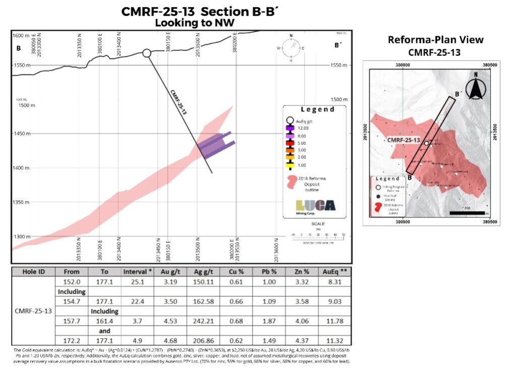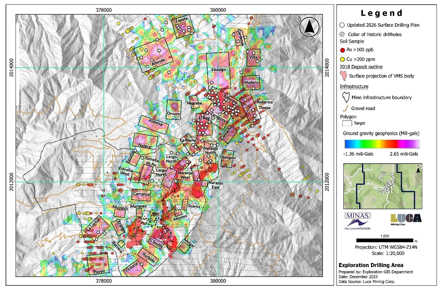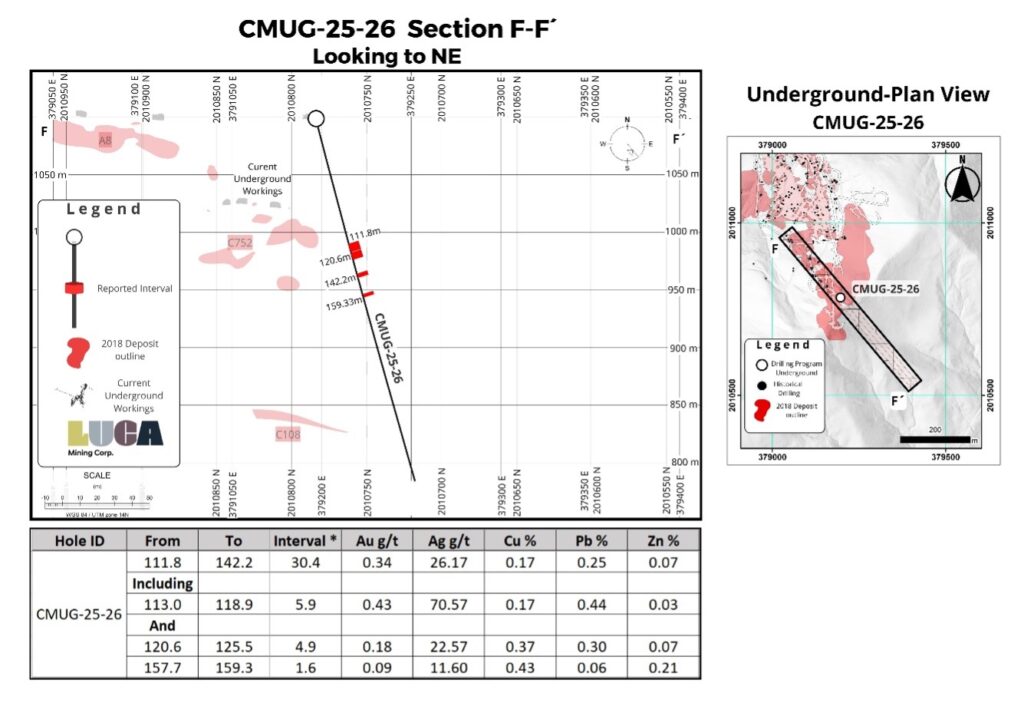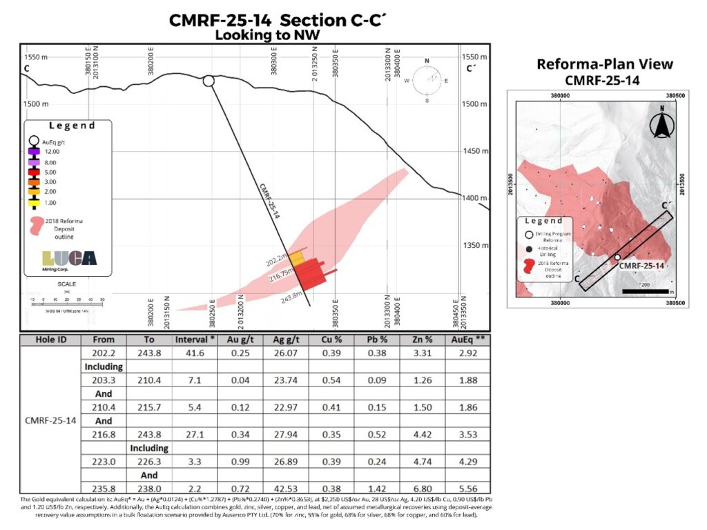 “The first drilling at El Rey in over 14 years has confirmed the presence of thick, gold- and silver-rich VMS mineralization and has meaningfully extended the deposit beyond previous interpretations, particularly along its western margin and at depth. El Rey shares key geological characteristics with the nearby Reforma deposit and represents an additional unmined source of mineralization with clear potential to support mine life extension and improve production flexibility at Campo Morado. Current interpretations suggest El Rey is a faulted-off portion of the Reforma deposit, opening up exploration potential both laterally and at depth for discovery of additional VMS mineralization. Drilling has also commenced at the Zapata target, where previously undrilled coincident gravity and geochemical anomalies have been identified. Zapata is one of 38 prospective targets defined within the Campo Morado concessions, and Luca looks forward to advancing these targets in the first half of 2026, with strong confidence in the potential for new VMS-style mineralized zones.”