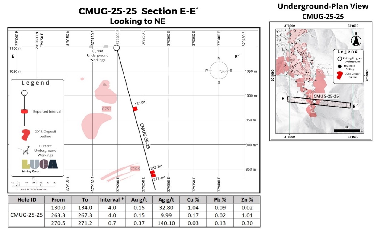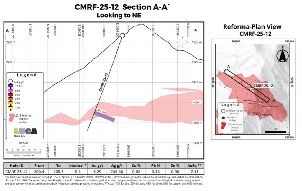 All drill core splits reported in this news release were analysed by Bureau Veritas of Durango, Mexico, utilizing the Multi-Acid digestion ICP-ES 35-element MA300 analytical package with FA-430 30-gram Fire Assay with AAS finish for gold on all samples. Au over-limits from FA-430 are re-analyzed by FA530 30-gram Fire Assay with Gravimetric finish. Ag over-limits from ICP MA300 analytical package are re-analyzed by FA530 30-gram Fire Assay with Gravimetric finish. Similarly, Cu, Pb and Zn over-limits from ICP MA300 analytical package are re-analyzed by ICP Multi-Acid digestion MA370 package. All core samples were split by core saw on-site at Luca’s core processing facilities at the Campo Morado Mine. Once split, half were placed back in the core boxes with the other half of split samples sealed in poly bags with one part of a three-part sample tag inserted within. Samples were collected by Bureau Veritas at the Campo Morado Mine site and transported to their laboratory in Durango, where they were prepared into 250-gram pulps for gold fire assay. The pulps were then shipped to Bureau Veritas’s Analytical laboratory in Vancouver, B.C., for final ICP analysis. A robust system of standards, 1/4 core duplicates and blanks was implemented in the 2025 exploration drilling program and is monitored as chemical assay data become available.