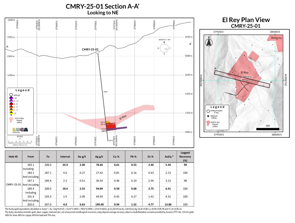 Surface drillholes CMRY-25-01 through CMRY-25-07 were collared within and around the El Rey and Reforma deposits and intersected notable intervals of massive sulphide mineralization (See Table 1), including: