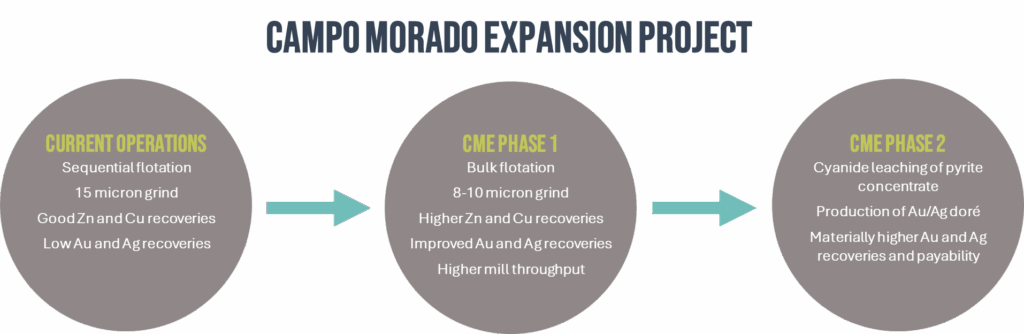 Phase 1 of the CME is being considered with the goal to achieve greater consistency in operational performance at the Campo Morado processing facilities, with improved pre-flotation, on-stream analysis of flotation concentration, and the addition of ultra-fine grinding capacity to achieve a target grind size of 8-10 microns (from current operational levels of a target regrind size of 15 microns).